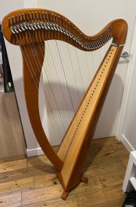 38 nylon strung lever harp in cherry finish on claw feet. This harp is 3.5 years old and in good condition. It does have some cosmetic marks and this is reflected in the price. It comes with dustcover, tuning key and 18 months left on the warranty – £2,000.00 (Location: Scotland. Please contact us for owners details)